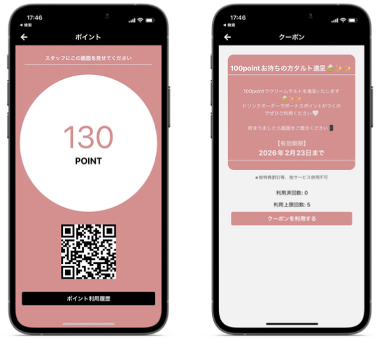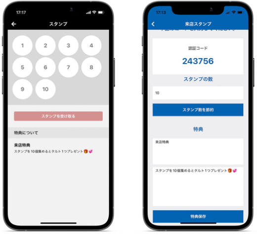・スタンプカードと同じ使い方です。来店回数、売り上げによるスタンプを付与すること。スタンプを全部貯める顧客が特典をもらう。
