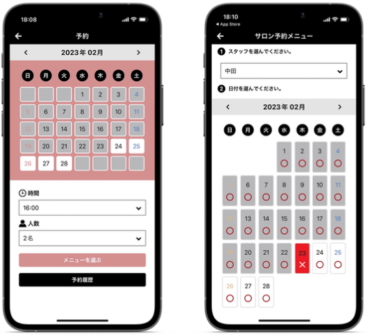 サロンや整骨院などの指名できる予約機能です。時間枠の設定やスタッフごとに対応できるメニューの設定ができます。